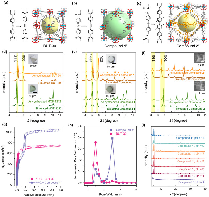 MOFs的生长条件通常由配位键强度决定,基于高价金属的稳定MOFs(如Zr-MOFs)通常需要高温和酸性调节剂才能生成晶态产物,而基于低价金属的不稳定MOFs则可以在室温中性溶剂中形成单晶。鉴于此,该团队开发了一种动态化学键导向的合成方法,在温和条件下即可得到稳定介孔Zr-MOFs的单晶。首先构建了具有稳定Zr羧基配位键和不稳定Cu-吡啶基团的MOFs模板,由于合成反应在室温进行,可以分离出具有介孔的动力学产物,而避免了热力学稳定的微孔MOFs生成。随后,通过单晶到单晶转变过程,不稳定的Cu-吡啶配体被长度相似且稳定的直线形有机配体取代,形成稳定的介孔MOFs的单晶。利用该策略成功构建了两种新型等网状reo拓扑结构MOFs,即Compound 1′和Compound 2′。其中,Compound 1′具有较高的孔隙率(N2吸附量为1045 cm3 g-1)、较大的孔径(2.5 nm)和较高的化学稳定性(pH值1-11)。此外,在Compound 1′中成功封装了一系列酸敏感材料,包括POM、CdSeS/ZnS量子点和金属配位笼。其中,POM@compound 1′对VX的降解具有较高的催化活性。本文报道了室温下动态化学键引导介孔稳定MOFs合成及原位封装纳米功能材料的应用,为合成稳定MOF和MOF基复合材料的研究提供新思路。
