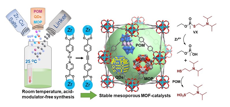 稳定介孔金属有机框架(MOFs)具有高比表面积、较大孔径(2-50 nm)和结构可调控性,在催化剂负载、吸附、分离等领域有广泛应用。但迄今报道的大多数MOFs均为微孔(孔径小于2 nm),介孔MOFs的比例不到1%,同时多数介孔MOFs存在稳定性不足问题。而稳定MOFs的合成通常需要高温和强酸环境,无法原位包覆不稳定的功能分子(如酶、量子点、金属配合物、部分杂多酸等)。因此,开发温和条件下(室温、中性溶剂)的稳定介孔MOFs的合成策略是一项非常迫切且具有挑战性的工作。近期,betway西汉姆联化学化工学院袁帅教授、左景林教授与国民核生化灾害防护国家重点实验室郑禾等人合作,首次突破了稳定介孔MOFs在室温、中性条件下合成的难题,实现了多种功能分子的原位稳定包覆和协同催化。