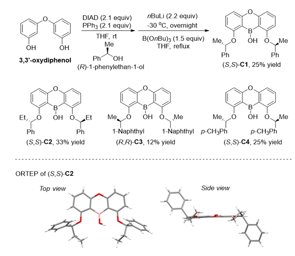 近日,公司郑文华课题组开发了首例新型C2对称手性硼酸催化剂并应用了在2,2-二取代-1,3-二醇的去对称化中。该课题组以10H-dibenzo[b,e][1,4]oxaborinin-10-ol骨架为基础,在硼酸两侧引入“手性臂”,设计了首例C2对称的手性硼酸催化剂,并以简洁的步骤合成了目标催化剂并通过单晶衍射进一步明晰了催化剂的空间立体结构。