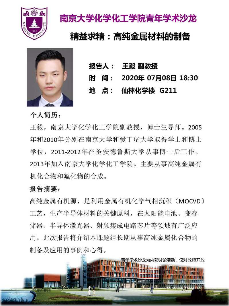 2020年7月8日 | 王毅 | 精益求精:高纯金属材料的制备 | 18:30 | G211 |