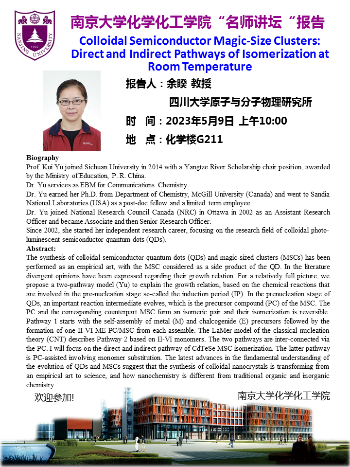 5月9日名师讲坛-余睽教授:Colloidal Semiconductor Magic-Size Clusters: Direct and Indirect Pathways of Isomerization at Room Temperature