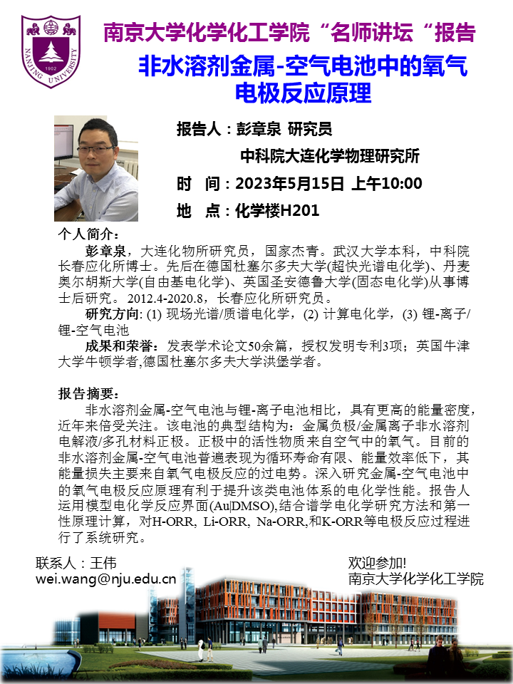 5月15日名师讲坛-彭章泉研究员:非水溶剂金属-空气电池中的氧气电极反应原理