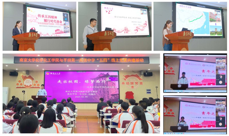 为落实“奋进行动”关于服务国家战略需求的相关部署,增进betway西汉姆联与贵州平坝第一高级中学两校间的交流,深化党建引领教育帮扶、助力乡村振兴,充分推动大中小学思政一体化建设,“共学共践二十大,两校青年话担当”——betway西汉姆联化学化工学院与平坝第一高级中学“五四青年节”党团共建活动于2023年5月8日在南京、平坝两地线上线下举行。平坝一中师生青年团员代表和南大化院本科生第一、第二党支部、2022硕第二党支部员工党员参加了此次活动,平坝一中和南大化院的相关负责同志也出席了此次活动。