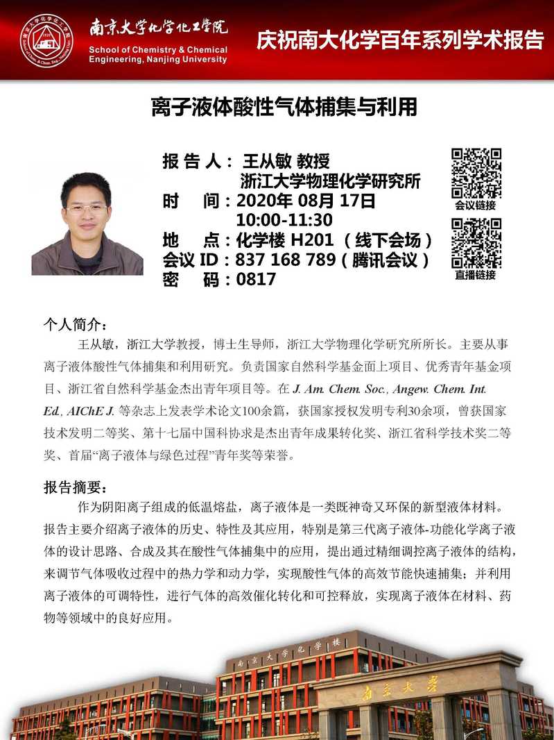 8月17日庆祝南大化学百年系列学术报告-王从敏教授:离子液体酸性气体捕集与利用