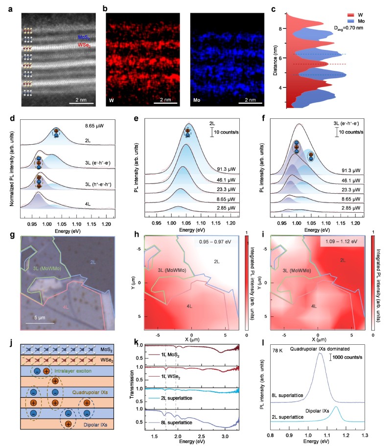 图3.四极矩层间激子发射显著增强的8层WSe2/(MoS2/WSe2)3/MoS2超晶格