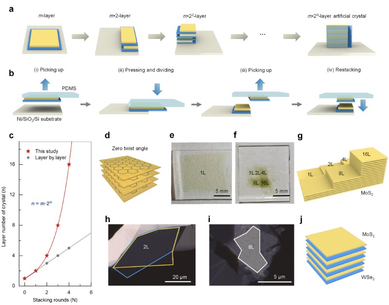 针对以上挑战,团队开发了一种2N构筑策略与工艺(图1),只需进行N次堆叠操作就能高效精准构筑m∙2N层人工激子晶体,其中m表示初始材料单元层数。该方法具有三个独特优势:1)大幅缩减自下而上构筑人工三维晶体的操作步骤,实现了层数的指数级增长;2)以0°层间扭转角进行层间耦合状态的高精度复制;3)适用范围广,自由度高。
