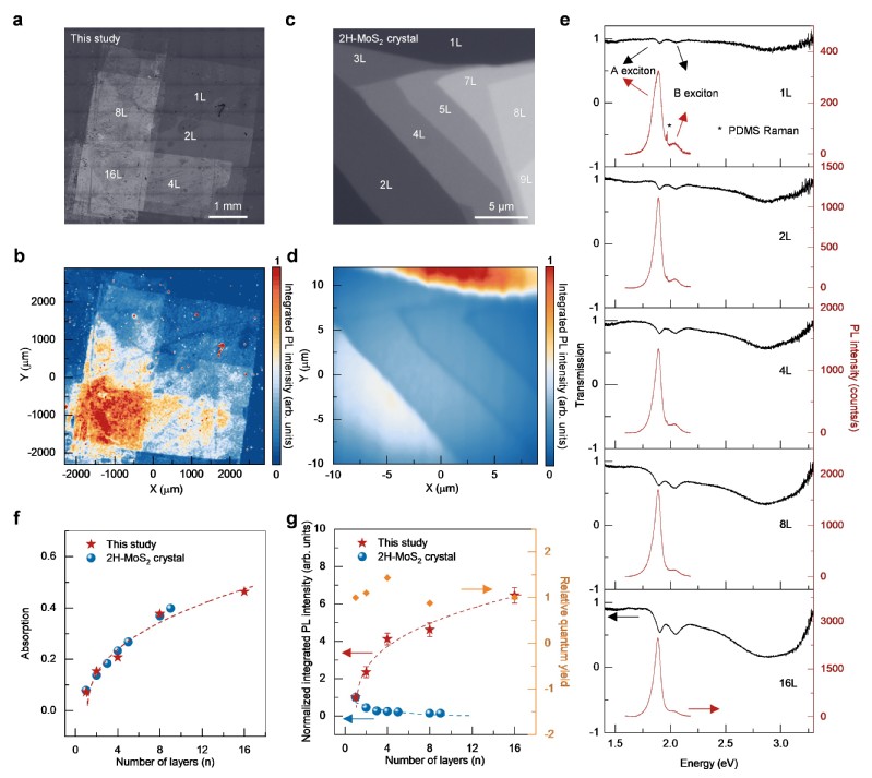 从厘米级单晶MoS2单层出发,制备得到毫米级无层间扭转角的弱耦合16层MoS2单晶,其保留了类单层的激子特性,层间弱解耦是该晶体中类单层激子特性得以保留的关键,并在吸收与光致发光性能上分别实现了高达643%和646%的增益(图2)。