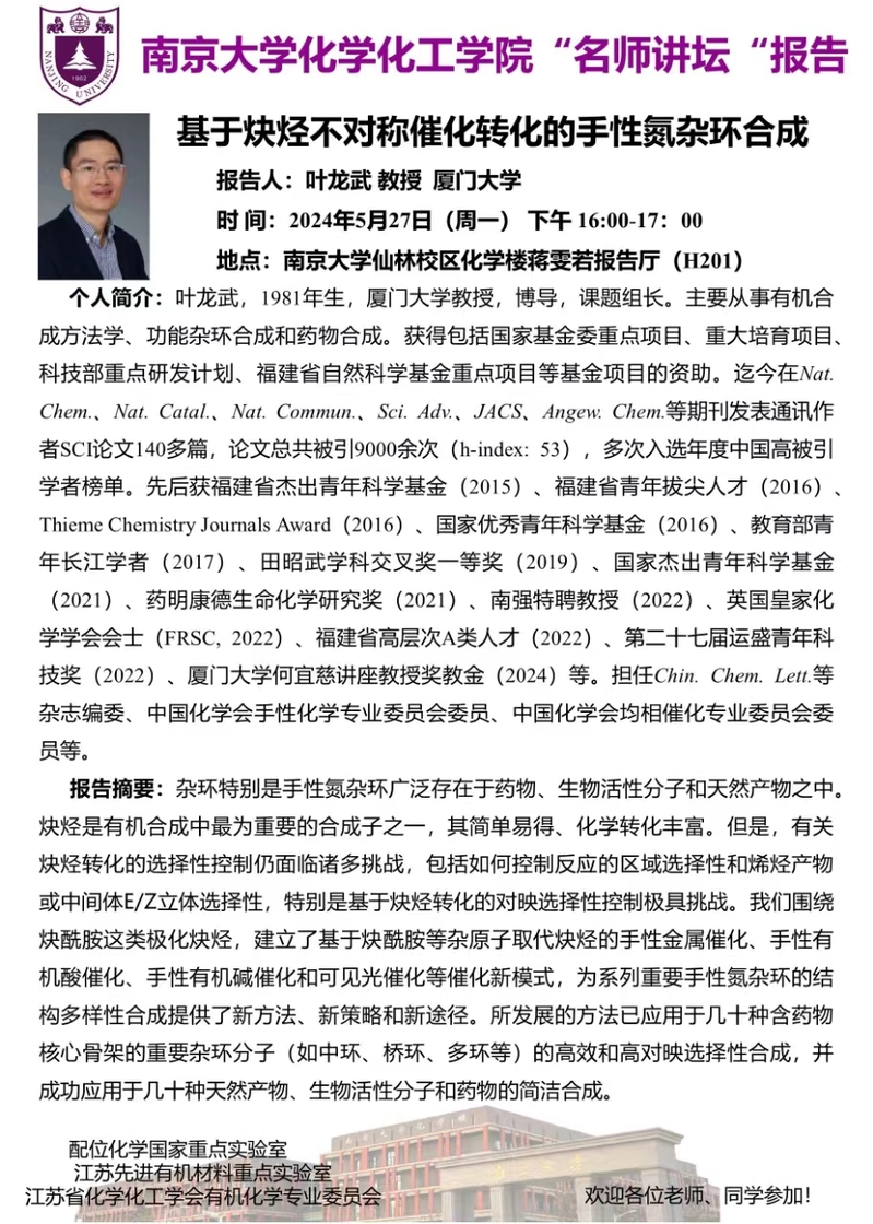 5月27日名师讲坛-叶龙武教授:基于炔烃不对称催化转化的手性氮杂环合成