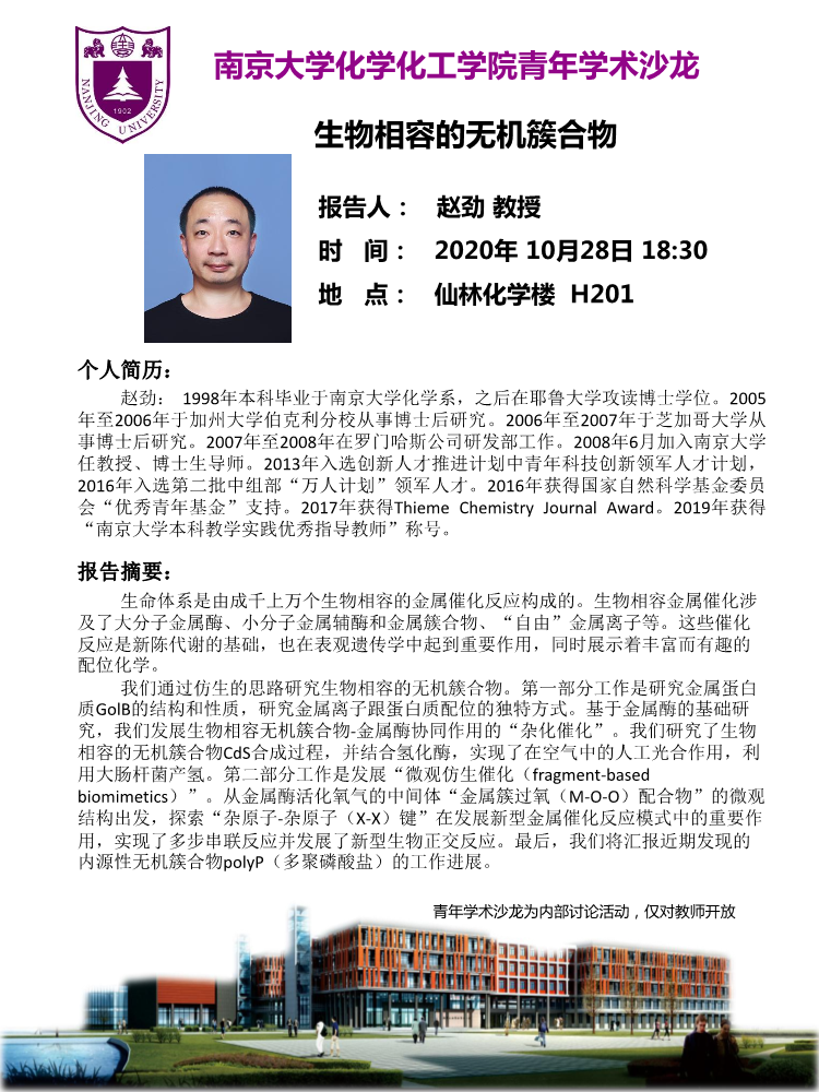 2020年10月28日 | 赵劲 | 生物相容的无机簇合物 | 18:30 | H201 |