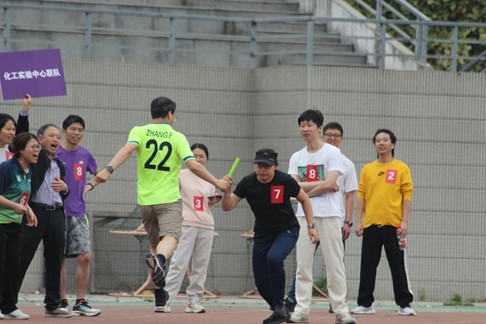 赛事为体现各专业老师之间的协作意识,接力规则有所创新,赛况激烈。比赛采用100米折返跑接力的形式,队员需在折返后回到起点完成交接棒,转身技巧与接力时机成为胜负关键。随着工会主席成义祥一声哨响,首棒选手如离弦之箭冲出起跑线。赛场上,机关涮劲队的精准配合、无机闪电队的爆发式冲刺、生机勃勃队的稳定反超等精彩瞬间引发阵阵欢呼,充分展现了化院师生分秒必争的拼搏精神。赛道旁,师生自发组成的啦啦队擂鼓挥旗,将赛事推向高潮。