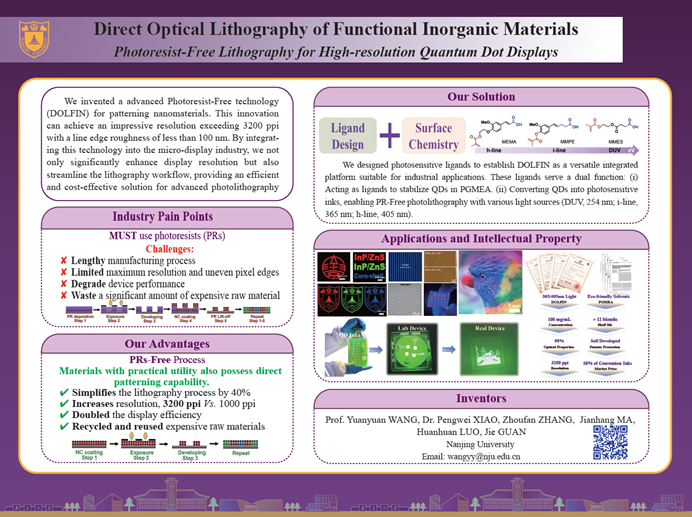项目简介:该项目通过配体工程实现了将无机纳米材料转化为具有光敏响应特性的功能油墨,彻底摆脱了对传统有机聚合物光刻胶的依赖。这一技术不仅简化了光刻步骤,还在图案精度上取得了显著突破,实现了高达3200 ppi的图案分辨率与小于100 nm的线边粗糙度。这种无胶光刻策略高度契合微型显示器制造的实际需求,显著提升了显示分辨率的同时,也降低了材料和工艺复杂性,为下一代高分辨率、低成本、绿色制造的先进显示技术提供了可行路径。