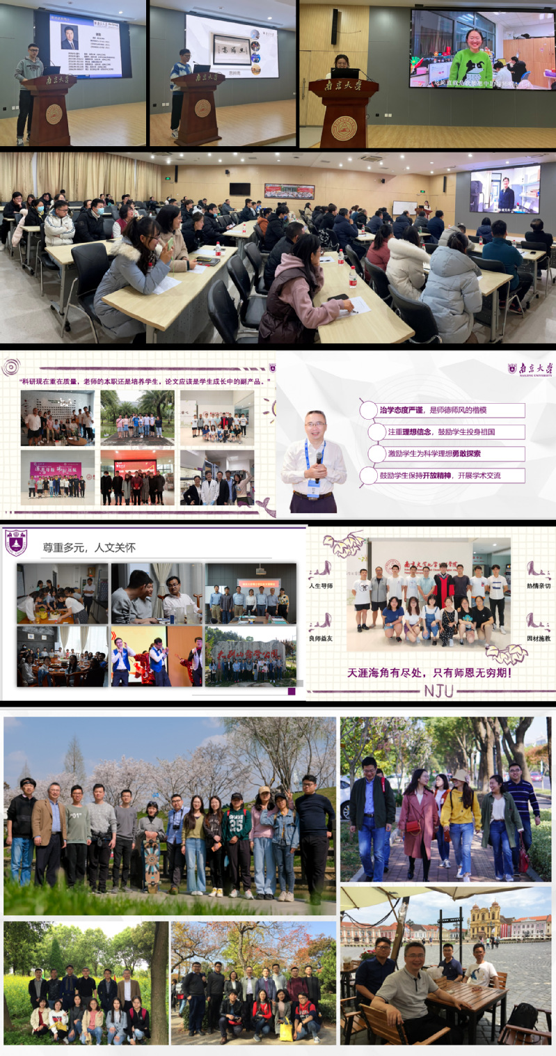 各研究生团队代表在答辩现场结合课题组特点,以多种形式表达对导师的感激和崇敬之情。王伟老师志趣高尚、春风化雨、尊重多元、人文关怀的育人理念深入人心。王晓老师对每位员工都一对一指导,小到实验大到课题方向,无微不至地关心员工的方方面面,更有已毕业的员工隔空为他送来的真挚祝福。田玉玺老师的研究生团队以硕士新生入学选导师的视角,全面展示了田老师对员工的关怀备至,对科研的严谨态度。吴洁老师用她的耐心、负责教会员工“做一行爱一行,保持对从事行业的热情就不会对生活失去希望”。张晶晶老师自2019加入学院工作后,与课题组所有成员“从0到1”搭建起一个完整的课题组,从老师、学长的双重角度出发,关心员工的发展,“只要对社会和国家有益的事情,我都鼓励你们去做”。“思辨斋”体现了胡文兵老师鼓励员工保持开放精神、“五育并举”的人才培养理念。“科研现在重在质量,老师的本职还是培养员工,论文只是员工成长中的副产物”是梁勇老师对员工的谆谆教诲。谢劲老师乐于培养员工对科学的热情,充分保障员工的科研条件,是员工们最坚实的后盾。雷建平老师鼓励员工挑战自我,解决卡脖子问题,永攀科研高峰,同时也组织丰富的课余活动,让每位员工人尽其才。