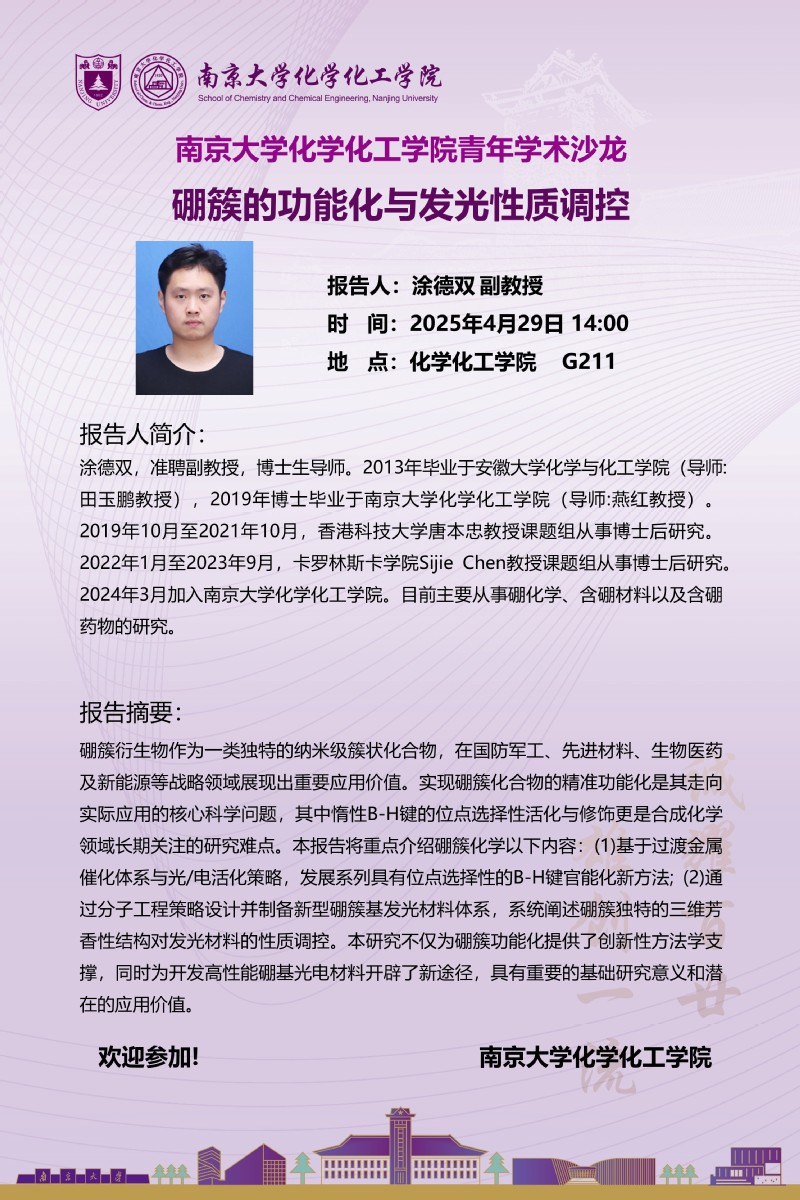 4月29日青年学术沙龙-涂德双副教授:硼簇的功能化与发光性质调控