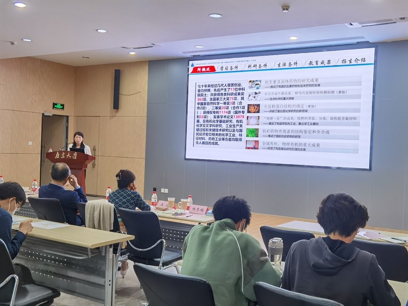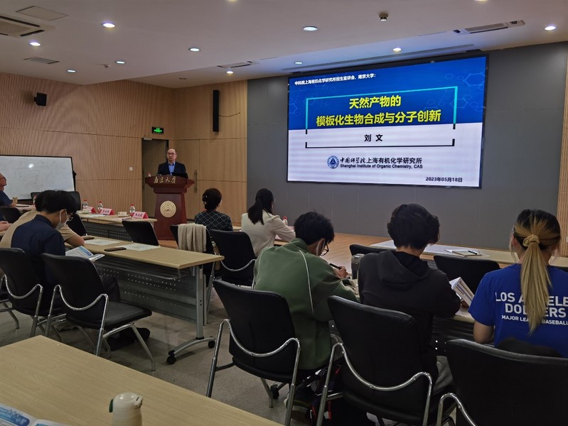 随后开展的招生宣传活动由陆红健主持。他首先介绍了刘文的简历和学术成就,刘文作了题为“天然产物的模板化生物合成与分子创新”的科普讲座,杨冬梅通过视频和讲演的形式对上海有机所概况、学习科研条件及2023年招生情况进行介绍,欢迎大家到有机所实地考察、体会。