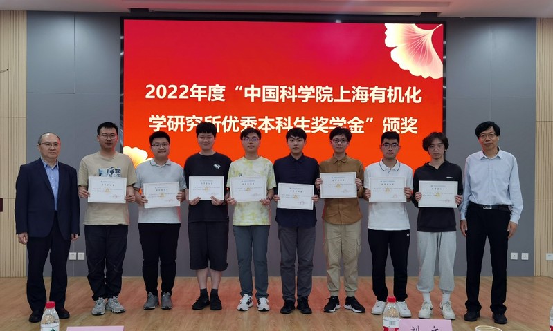朱成建宣读了《化学化工学院关于颁发2022年度“中国科学院上海有机化学研究所优秀本科生奖学金”的决定》,刘文、朱成建共同为获奖同学颁发证书并合影留念。