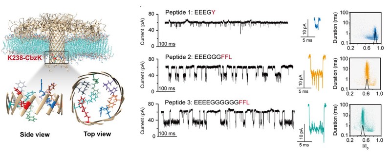 图1. 非天然氨基酸构建的纳米孔道灵敏域用于多肽单分子分析。