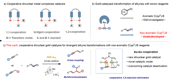 图1. 协同双金属催化与双核金协同催化的非芳香性C(sp2)-B试剂转化