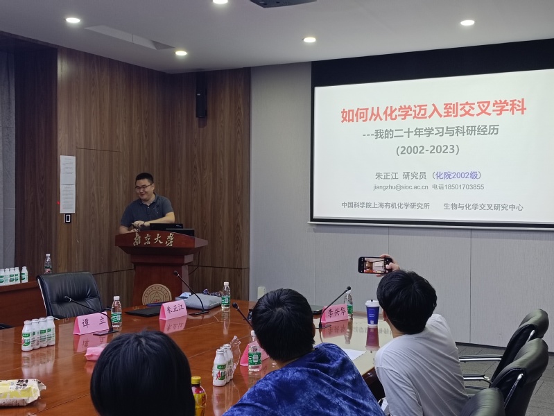 活动第二部分中,两位员工分别从各自的南大生活讲起,介绍自己的学科交叉之路。朱正江介绍了自己三次不同的学科交叉经历。他建议同学们,“对于本科生而言,科学启蒙是重要的,研究方向和成果是次要的“。谭立向同学们介绍了自己目前的研究方向,并且欢迎感兴趣的同学加入他的课题组。他强调了求知欲的重要性,鼓励同学们要敢于尝试、擅长合作,希望同学们可以利用自己的化学学科背景作为迈入交叉学科的途径。
