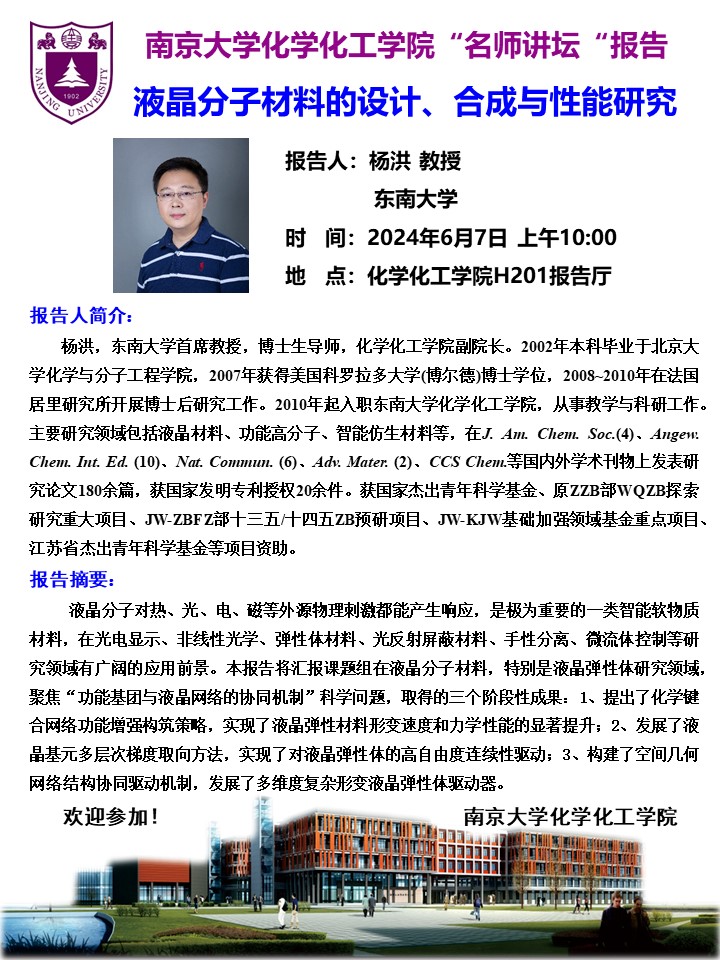 6月7日名师讲坛-杨洪教授:液晶分子材料的设计、合成与性能研究