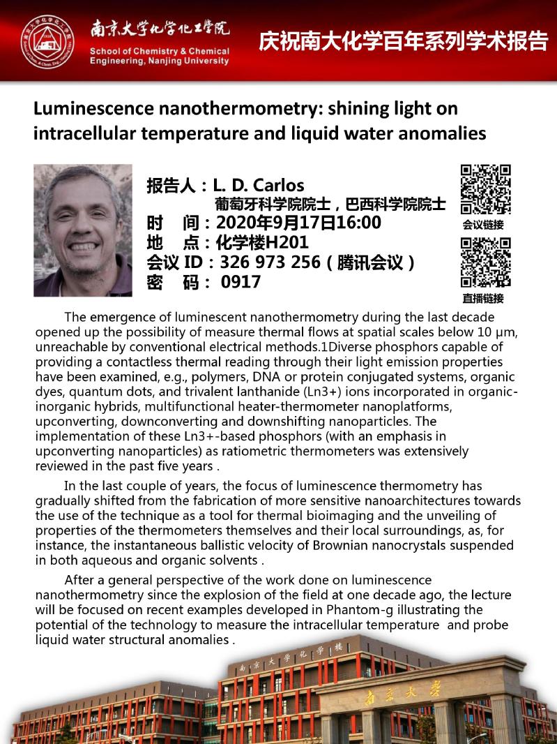 9月17日庆祝南大化学百年系列学术报告-L. D. Carlos:Luminescence nanothermometry: shining light on intracellular temperature and liquid water anomalies