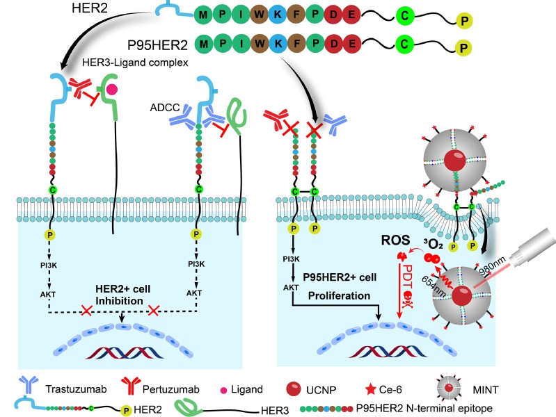 图1. MINT特异性靶向P95HER2+癌细胞并产生ROS杀伤癌细胞原理图.