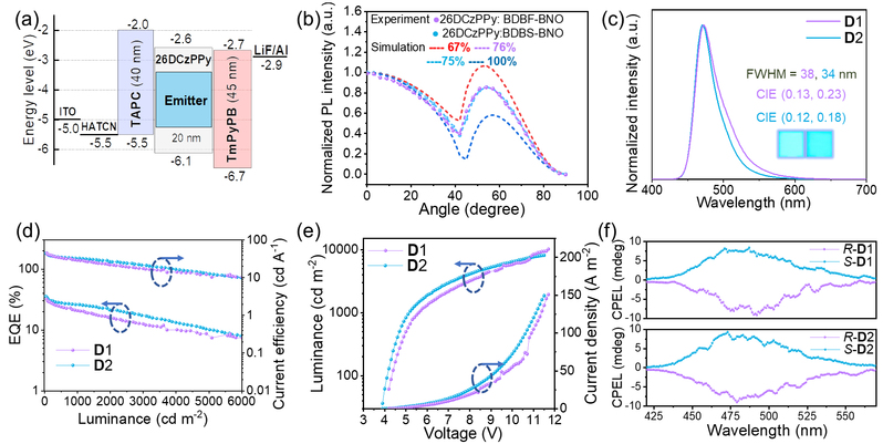 图3. (a) D1和D2的OLED性能:(a) 材料能级图和器件结构; (b) 掺杂膜中材料的角度依赖性光致发光光谱特性曲线; (c) 器件的EL光谱和CIE坐标; (d) EQE -亮度-电流效率曲线; (e) 亮度-电压-电流密度曲线; (f) R/S-D1和R/S-D2的CPEL光谱。