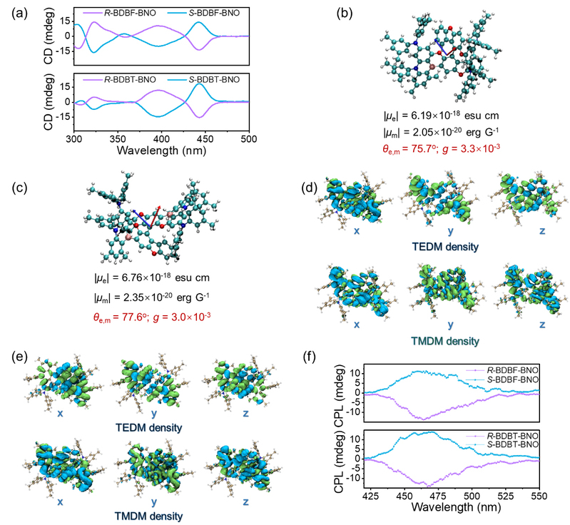 图2.(a)甲苯溶液中(R/S)-BDBF-BNO和(R/S)-BDBT-BNO的CD光谱;理论计算的(b) (S)-BDBF-BNO和(c) (S)-BDBT-BNO的S1态的跃迁电偶极矩(红色箭头)、磁偶极矩(蓝色箭头)和夹角;(d) (S)-BDBF-BNO和(e) (S)-BDBT-BNO的TEDM和TMDM密度分布;(f) 甲苯溶液中(R/S)-BDBF-BNO和(R/S)-BDBT-BNO的CPL光谱。