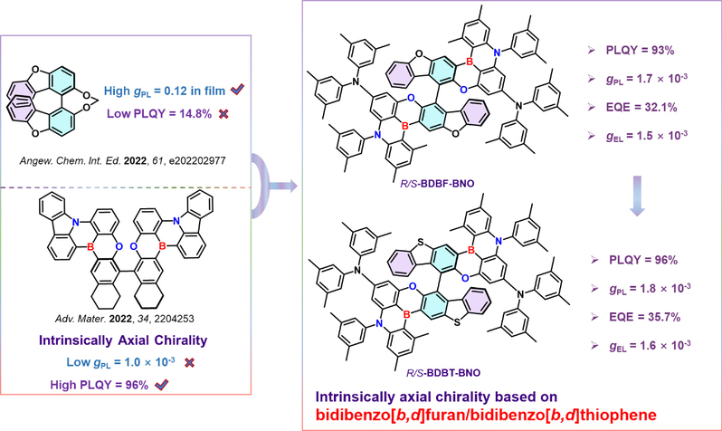 为了解决这一问题,郑佑轩课题组在之前的工作中提出了一种空间位阻辅助的双核策略来合成CP-MR-TADF材料,从而使手性八氢联萘酚单元可以参与到前线轨道分布中,提高了材料的CPL 性能(Adv. Mater., 2022, 34, 2204253)。但是由于八氢联萘酚基团在前线轨道分布中的占比不够高,CPL发光强度较弱,不对称因子(g)也仅为1.0×10-3。与手性八氢联萘酚单元相比,[1,1’-联二苯并[b,d]呋喃]-2,2’-二醇分子更加扭曲,具有更多的分子内基团重叠,空间位阻大,有利于实现更好的CPL性能。因此,预计通过将该手性单元与MR-TADF单元相结合,可以得到具有更优良CPL性能的CP-MR-TADF材料并制备CP-OLED器件。