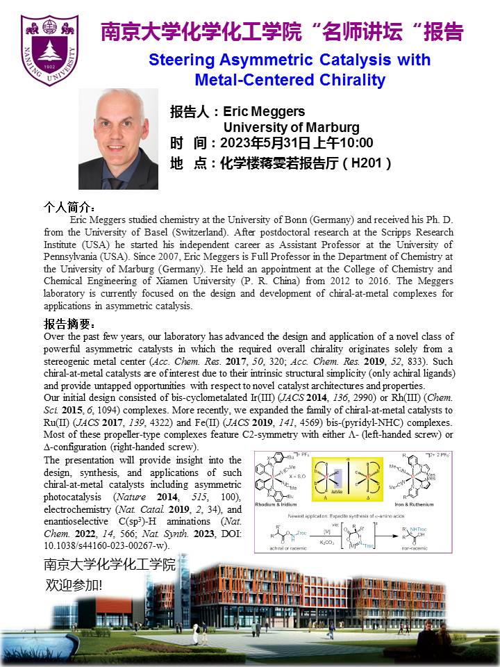 5月31日名师讲坛-Eric Meggers:Steering Asymmetric Catalysis with Metal-Centered Chirality