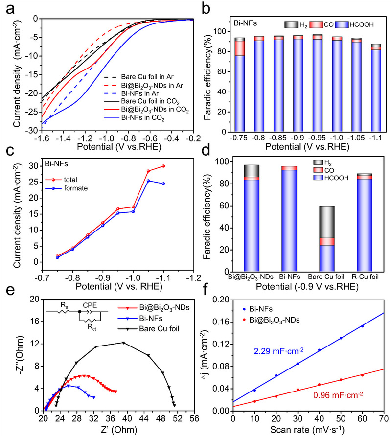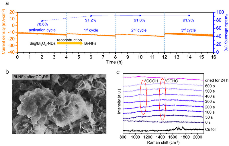 通过对比裸铜箔、Bi@Bi2O3-NDs和Bi-NFs的各方面电化学性能,可判定Bi-NFs在经过原位重构后得到了更低的阻抗、更大的电化学活性面积以及更多的活性位点,进而使得电催化CO2转化为甲酸的选择性获得大幅提高(图4)。最后,将生长了Bi@Bi2O3-NDs的电极片用于长时间的CO2电还原稳定性测试。在首圈中,Bi@Bi2O3-NDs尚未完成原位重构过程,缺乏对应的活性位点和电化学性能,故而甲酸的法拉第效率偏低。而重构成为Bi-NFs后,甲酸的法拉第效率大幅提高,并且能维持16小时的稳定(图5a)。这种Bi-NFs的形貌在长循环后也仍能得到保持(图5b)。此外,通过原位拉曼光谱,可判明在CO2还原过程中,*OCHO中间体的稳定起到了关键性作用(图5c)。结合XPS证据,可判断出原位重构的Bi-NFs具有丰富的Bi0活性位点,起到了对*OCHO中间体的稳定吸附作用,进而保证了甲酸的转化路径,最终提高了电催化的选择性。