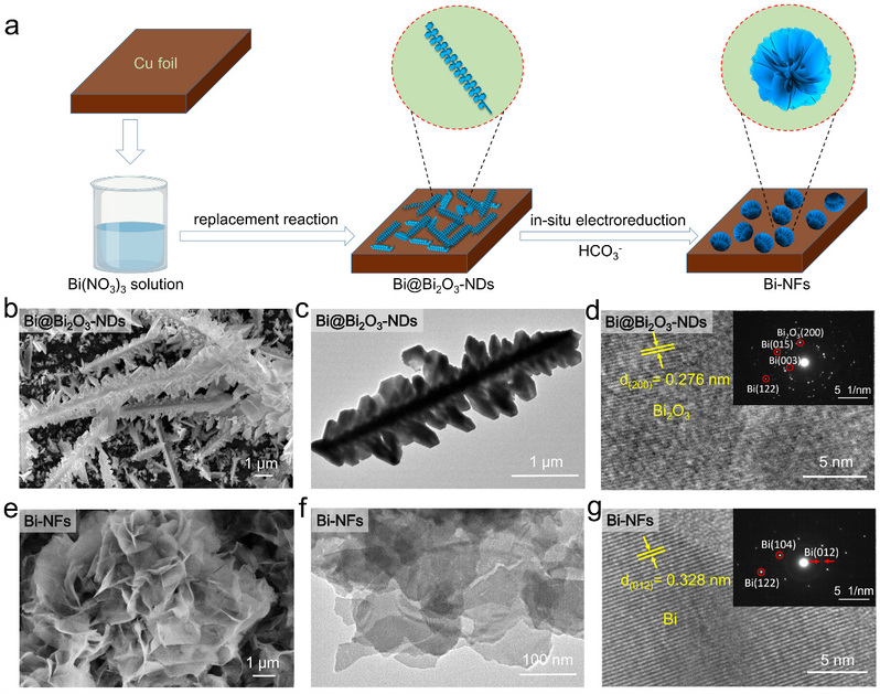 betway西汉姆联金钟团队设计并成功合成了由Bi@Bi2O3纳米枝晶(Bi@Bi2O3-NDs)转化而得的Bi纳米花材料(Bi-NFs)(图1),用于高效电催化CO2RR生产甲酸,实现了92.3%的高法拉第效率。此外,该工作探明了Bi基催化剂在电催化中以Bi2O2CO3为中间体的两步原位重构过程。进一步地,通过原位拉曼光谱,证实了催化过程中还原形成的0价Bi活性中心对于*OCHO中间体的选择性稳定吸附,这是实现高选择性的关键因素。