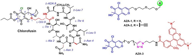 图1. 阿扎菲酮类型天然产物Chlorofusin和研究开发的新分子工具AZA-n系列.