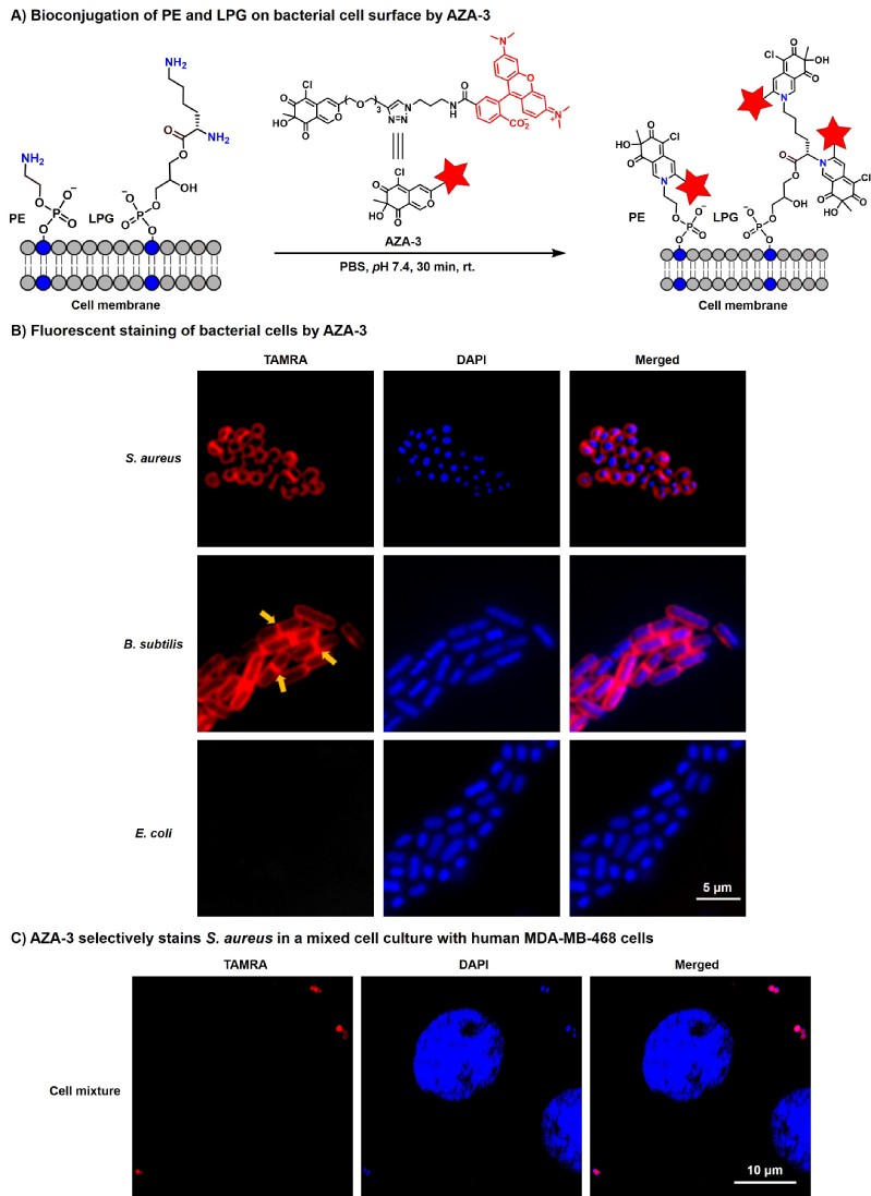 鉴于阿扎菲酮分子工具对伯胺高度的化学选择性修饰特性,研究者再次扩展将另一分子工具AZA-3应用于含有伯胺基团磷脂的修饰分析。鉴于革兰氏阳性菌与阴性菌、哺乳动物细胞在细胞膜磷脂组成上的显著差异,细胞影像实验清晰表明,分子工具AZA-3成功实现了对革兰氏阳性菌的选择性修饰,为复杂样品中革兰氏阳性菌病原体的检测提供了一种新的方便技术手段(图2)。