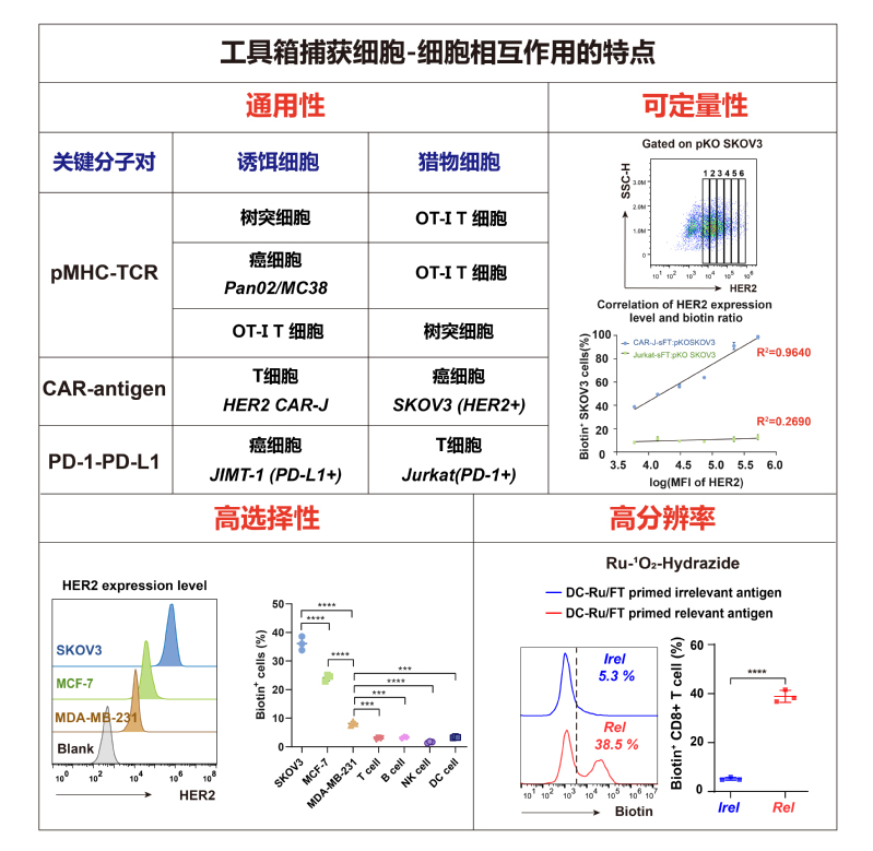Cell-sFT、Ab-sFT、Ru-L、Ru-G和Ru-H这些探针共同组成了研究细胞-细胞相互作用的邻近标记工具箱,利用这些探针他们将酶或小分子催化剂分别装载到了鼠的树突细胞、癌细胞和OT-I T细胞、人的CAR-T细胞和癌细胞上,对由肽主要组织相容复合物-T细胞受体(pMHC-TCR)所介导的树突细胞-T细胞、癌细胞-T细胞和T细胞-树突细胞间的相互作用、由嵌合抗原受体-抗原(CAR-antigen)所介导的T细胞-癌细胞间的相互作用和程序性死亡受体-配体(PD-1-PD-L1)所介导的T细胞-癌细胞间的相互作用实现成功捕获,展现了邻近标记工具箱捕获细胞间相互作用的通用性;另外他们还阐述了工具箱捕获细胞间相互作用具有可定量性、高选择性和高分辨(Ru-1O2-hydrazide系统)等特点(图3)。值得指出的是,该系统可以实现对CD4 T细胞和不同抗原呈递细胞的特异性和异质性的解析,解决了免疫学研究中二类分子MHC多聚体和TCR多聚体难以构建的问题。