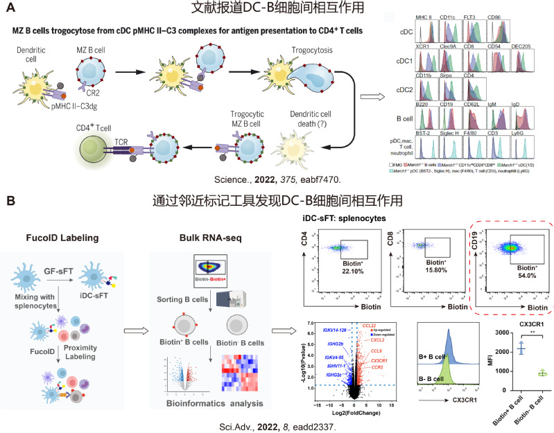 在未来的免疫学研究中,细胞间邻近标记工具可以广泛应用于发现未知的细胞间相互作用。例如,李劼团队利用其开发的Cell-sFT探针,成功揭示了树突状细胞(DC)与B细胞间存在的强相互作用,并在邻近标记下游结合转录组测序分析阐述了DC-B细胞相互作用的机制,为将来研究人员发现更有意义的未知细胞间相互作用及机制提供了研究范式(图4)。未来的研究可以探索将邻近标记工具箱与单细胞测序分析平台相结合的可能性。这种结合可以更加方便和高效地了解介导细胞相互作用的分子信息,为人们深入理解维持正常生理过程和引起疾病发病过程中的重要细胞相互作用及其机制提供了新思路。