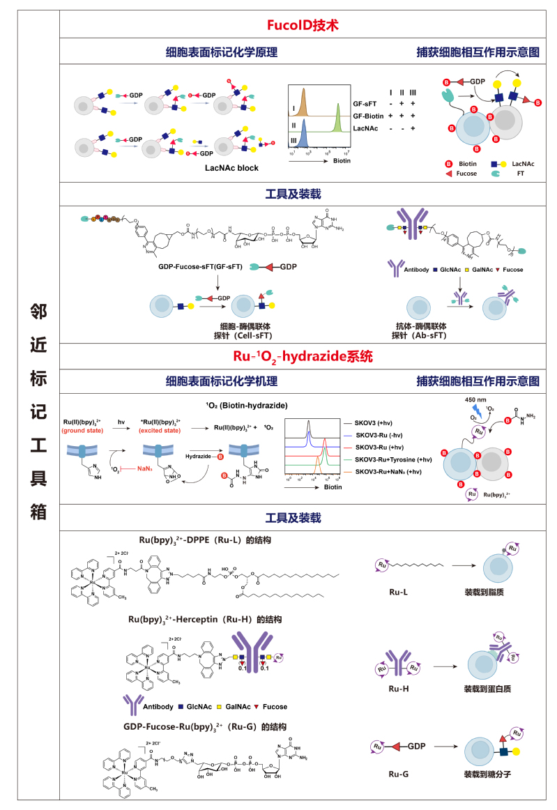 近年来,李劼团队和合作者一起利用酶和小分子催化剂设计构建了多种用于研究细胞间相互作用的邻近标记工具(Cell, 2020, 183, 1117;J. Am. Chem. Soc., 2022, 144, 5517)。为了进一步满足免疫学和医学中的不同应用场景,他们基于之前用于研究DC-T细胞间相互作用的FucoID技术,利用岩藻糖转移酶(FT)的定点化学偶联发展了细胞-酶偶联体探针(Cell-sFT)和抗体-酶偶联体探针(Ab-sFT)。当有其它细胞与诱饵细胞相互作用时,FT可以将鸟苷二磷酸岩藻糖生物素(GDP-Fucose-Biotin)的底物标记到与诱饵细胞相互作用的细胞上的N-乙酰-D-乳糖胺(LacNAc)上,进而对细胞间相互作用实现捕获。另外,他们还利用过渡金属钌配合物Ru(bpy)32+开发了光控的Ru-1O2-hydrazide系统用于捕获细胞-细胞相互作用,通过生物正交反应分别将Ru(bpy)32+与1,2-双(二苯膦)乙烷(DPPE)、抗体(Herceptin)和鸟苷二磷酸岩藻糖(GDP-Fucose)偶联在一起,合成了三种Ru(bpy)32+衍生物:Ru-L、Ru-G和Ru-H,成功实现将Ru(bpy)32+装载到诱饵细胞表面的脂质、蛋白质和糖分子上,在450 nm光照和底物生物素酰肼(Biotin-hydrazide)存在下通过单线态机理对细胞间相互作用实现捕获(图2)。