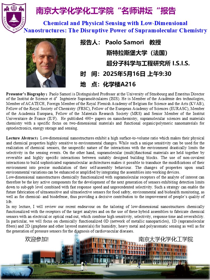 5月16日名师讲坛-Prof. Paolo Samorì:Chemical and Physical Sensing with Low-Dimensional Nanostructures: The Disruptive Power of Supramolecular Chemistry