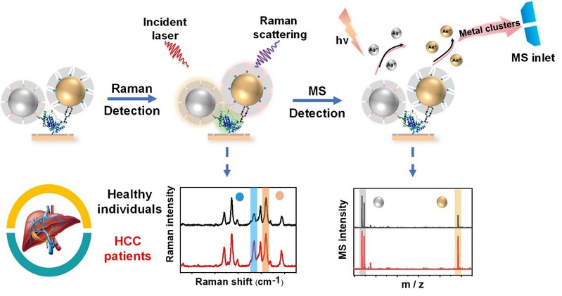鉴于此,刘震教授团队在前期分子印迹技术 (Angew. Chem. Int. Ed.2015, 54, 10211-10215; Nat. Protoc.2017, 12, 964-987; Chem. Sci.2019, 10, 1831-1835) 和等离激元免疫分子技术((Angew. Chem. Int. Ed.2016, 55, 13215–13218; Nat. Protoc.2021, 16, 3522–3546)的基础上发展出一种糖型分辨双模态比率免疫夹心法。该方法通过分子印迹材料等肝癌标志物糖蛋白甲胎蛋白的识别,特别是一个能“以一抵十”的糖链印迹材料对含有唾液酸修饰和核心岩藻糖修饰的糖基化异构体的精准识别,利用表面增强拉曼散射和激光辅助电离质谱两种模态下产生的比率信号来实现对肝癌的精准诊断(原理见图1)。