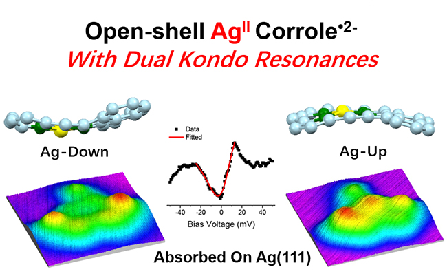 Ag-1 晶体的构型为咔咯币族金属配合物最普遍的马鞍形构型。而当 Ag-1 被吸附到 Ag(111)基底表面后,其呈现的是从未出现过的两种不同朝向的拱形构 型(图 1,依据 Ag 原子与基底的距离大小,分别称作“Ag-Up” 和“AgDown”)。STM 实验结果显示,在两种不同构型分子的中心金属和咔咯环上的 位点处均可以探测到明显的近藤信号,且强度由中心金属向咔咯环上的位点处 递减。这类在中心金属和配体环上均具有近藤信号的双通道分子,为自旋电子 学领域的微型化数据存储和逻辑门器件的设计提供了新途径。 该工作以“Ligand Non-innocence and Single Molecular Spintronic Properties of AgII Dibenzocorrole Radical on Ag(111)”发表在 Angew. Chem. Int. Ed. 2021, 60, 11702 –11706。betway西汉姆联化学化工学院徐嘉梁博士和物理学院朱立博士为共同 第一作者,物理学院李绍春教授、化学化工学院吴凡特任副研究员和沈珍教授 为共同通讯作者。该工作得到了配位化学国家重点实验室、人工微结构科学与 技术协同创新中心、国家自然科学基金的支持或资助。