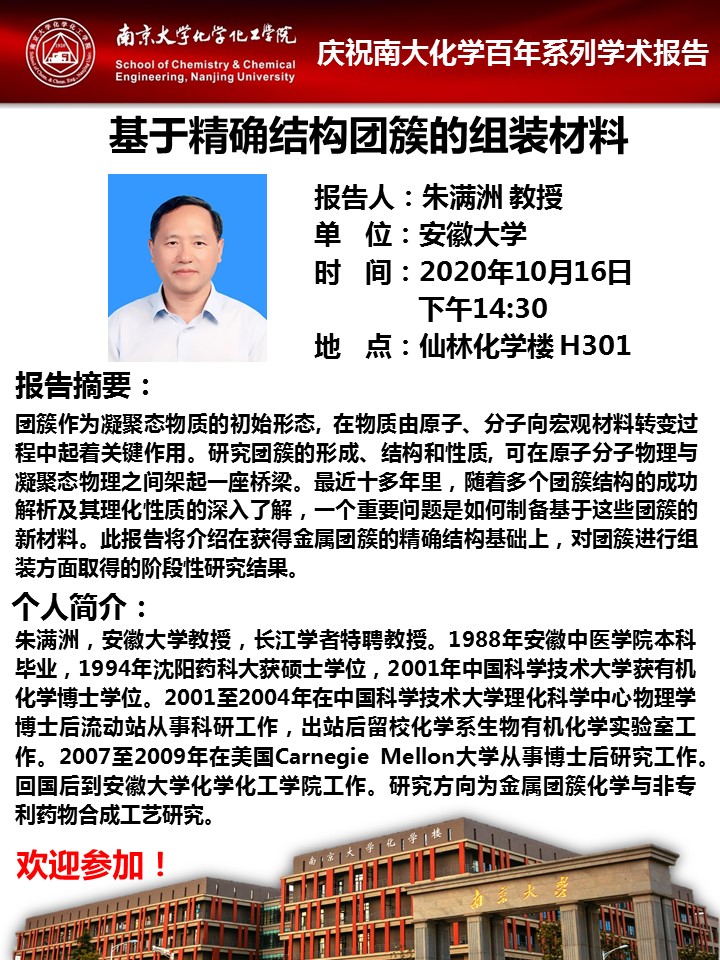 10月16日庆祝南大化学百年系列学术报告-朱满洲 教授:基于精确结构团簇的组装材料