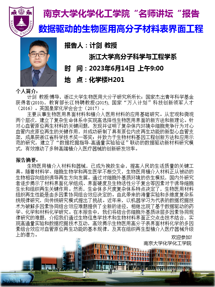 6月14日名师讲坛-计剑教授:数据驱动的生物医用高分子材料表界面工程