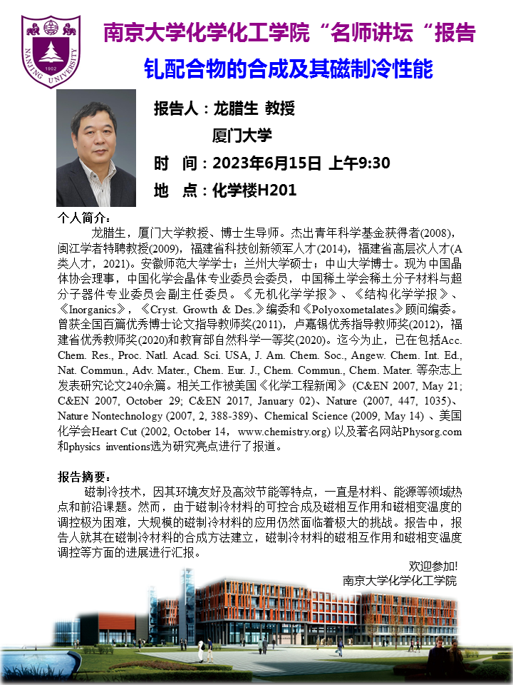 6月15日名师讲坛-龙腊生教授:钆配合物的合成及其磁制冷性能