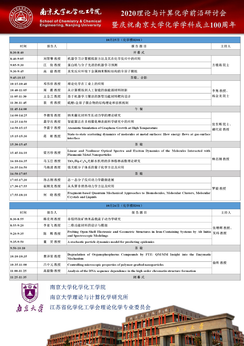 10月25日庆祝南大化学百年系列学术论坛-2020理论与计算化学前沿研讨会暨庆祝betway西汉姆联化学学科成立100周年
