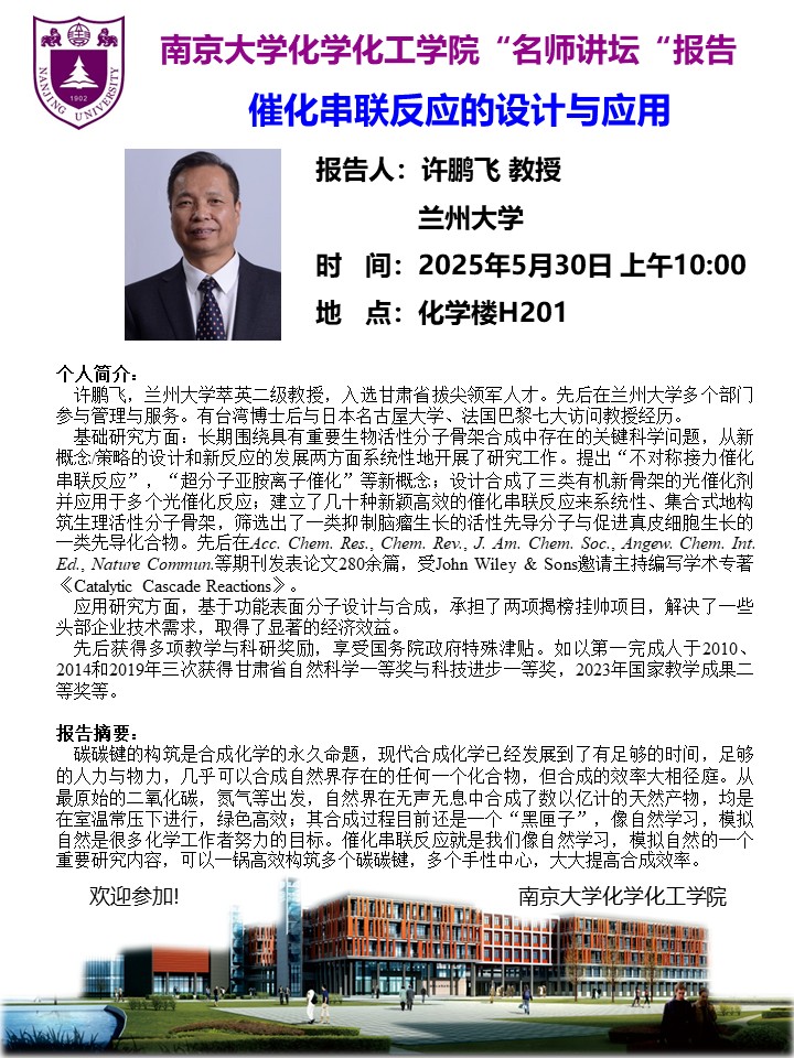 5月30日名师讲坛-许鹏飞教授:催化串联反应的设计与应用