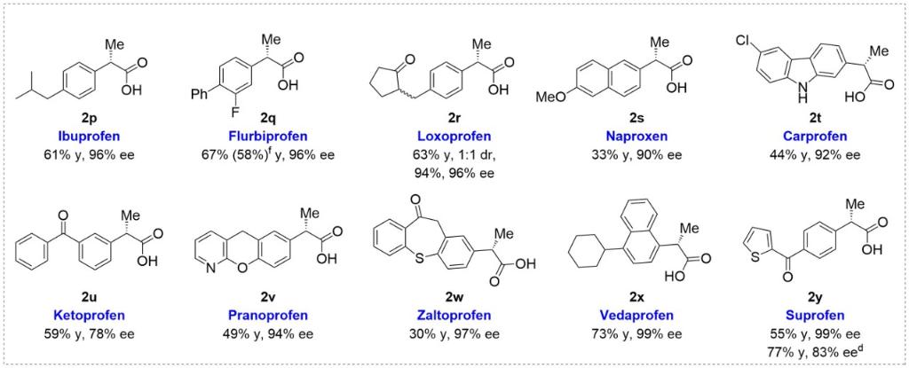 该电酶催化体系展现出卓越的底物普适性与官能团兼容性(图4)。针对结构多样的外消旋α-支链醛类化合物,可实现精准的手性控制,高效转化为α-手性羧酸产物(最高99% ee)。文章展示了25个例子,实验成功制备了十种具有生物活性的(S)-丙酸类药物(2p-2y),包括氟比洛芬、布洛芬、萘普生等,产率良好至优异,对映选择性最高达99% ee。同时,该电酶催化方案可以以相同的效率和对映选择性放大到1 mmol级别。