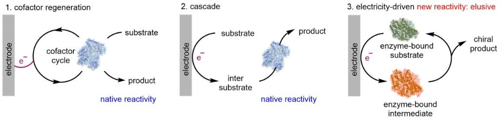 近年来,人工酶和光酶催化等策略的发展,不断突破生物合成的边界。另一方面,电化学合成作为化学合成领域快速发展的创新工具,具有廉价、电势可控和可持续等多重优势。当前电化学合成与酶催化的结合主要集中在以下两类(图1):通过电化学来实现酶的辅因子再生,继而实现酶的天然反应;电化员工成的中间体或底物参与后续酶催化天然转化中(电化学/酶级联)。然而,如何利用电化学驱动酶催化,去解锁非天然的新催化模式,仍待突破。