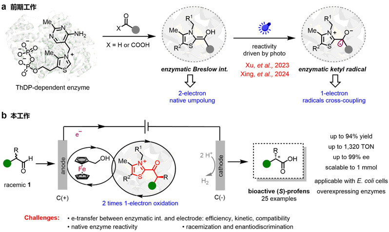 公司黄小强研究员自2021年开展独立研究以来,通过酶学机制设计和蛋白定向进化改造策略,成功开发了几类新酶催化功能。在光酶催化领域,黄小强团队首创焦磷酸硫胺素(ThDP)依赖的自由基酰基转移酶(Nature 2024, 625, 74:betway西汉姆联黄小强/梁勇及合作者《Nature》发文:创制新光酶元件,引领光生物制造新方向;Nature 2025, 637, 1118:betway西汉姆联黄小强团队《Nature》:推动光酶领域到复杂多组分转化),突破了不对称生物合成的边界。在此基础上,团队在不对称电酶催化领域取得新突破:融合二茂铁甲醇介导的阳极氧化和ThDP依赖酶催化,解锁了电酶催化的动态动力学氧化新体系(图2)。团队开发的电酶协同催化策略,创新性地将2次单电子氧化机制引入酶中,结合定向进化技术优化蛋白的活性中心,最终成功赋予了ThDP依赖酶催化动态动力学氧化的新活性。该体系以清洁电能替代传统化学氧化剂,可在较低酶负载量下(0.05 mol%),实现布洛芬、萘普生等十种(S)-芳基丙酸类抗炎药物的高效合成,对映选择性高达99% ee,并兼容全细胞催化与规模化制备。