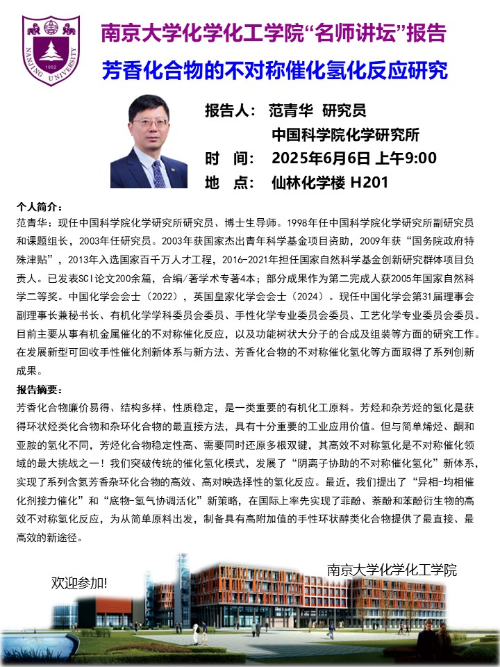 6月6日名师讲坛-范青华研究员:芳香化合物的不对称催化氢化反应研究