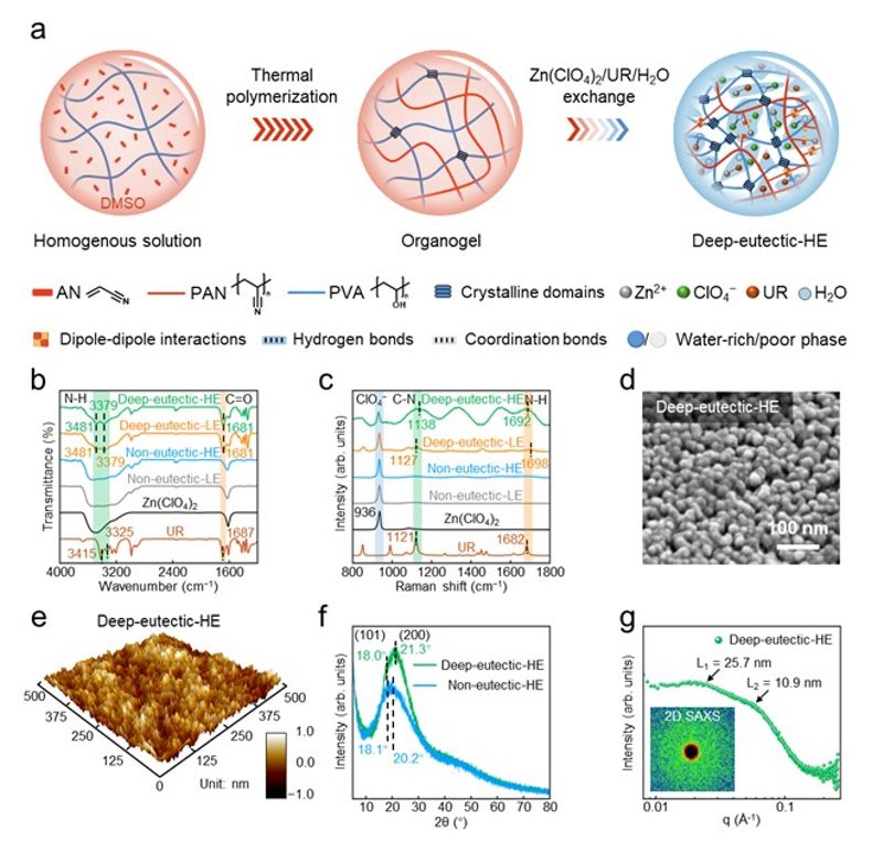 研究团队首先展示了深共晶水凝胶电解质的精妙制备策略(图1a)。通过二甲基亚砜介导聚乙烯醇和丙烯腈的溶解,加热引发丙烯腈原位聚合,最后通过溶剂交换实现DMSO与深共晶电解液的置换。在这一过程中,聚乙烯醇的亲水相与聚丙烯腈的疏水相自发组织成双连续纳米相分离结构,相区尺寸仅为10-30纳米,远低于可见光波长。红外光谱分析(图1b)揭示了深共晶体系中关键分子相互作用:氨基甲酸乙酯(UR)的N-H不对称伸缩振动发生54-66 cm−1的蓝移并伴随峰展宽,同时C=O伸缩振动红移6 cm−1,证实了UR与Zn2+的配位以及三维氢键网络的形成。拉曼光谱(图1c)进一步验证了这一相互作用,UR的C-N和N-H伸缩频率分别偏移+17和+10 cm−1。扫描电镜图像(图1d)清晰展示了10-30 nm的纳米相分离形貌,而原子力显微镜(图1e)则进一步确认了约20 nm的相区尺寸。X射线衍射图谱(图1f)显示深共晶水凝胶中PVA的(101)和(200)衍射峰显著增强,表明结晶度提高,为优异力学性能提供了结构基础。小角X射线散射(图1g)定量解析出25.7 nm和10.9 nm两个特征距离,分别对应疏水相区和结晶相区的间距,与电镜观察结果高度吻合。