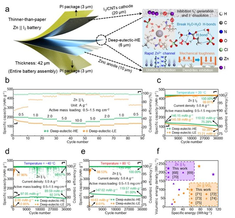这项工作提出了一种全新的深共晶水凝胶电解质设计策略,通过纳米相分离、水合共晶溶剂化及氢键网络的协同作用,实现了同时具备优异机械稳定性(断裂强度4.1 MPa、韧性13.66 MJ m−3)、高Zn2+电导率和宽温度耐受性(−40 °C至80 °C稳定运行)的多功能锌离子电池电解质材料。该设计有效调控Zn2+传输路径,促进均匀锌沉积并抑制枝晶形成,在Zn||I2全电池中展现出36,000次循环的卓越循环耐久性(涵盖−40 °C至80 °C多温度条件)及提升的倍率性能。其薄层结构赋予了电池器件42 μm的极致轻薄厚度、108.99 Wh kg−1的高质量能量密度和236.62 Wh L−1的高体积能量密度,同时保持良好柔韧性与机械耐久性,满足苛刻环境使用需求。通过分子设计、相调制与工艺工程的协同整合,这项研究构建了面向可穿戴电子设备的高能量密度柔性电池开发方法框架,为兼具恶劣环境耐久性的先进柔性储能器件提供了实用技术路径。